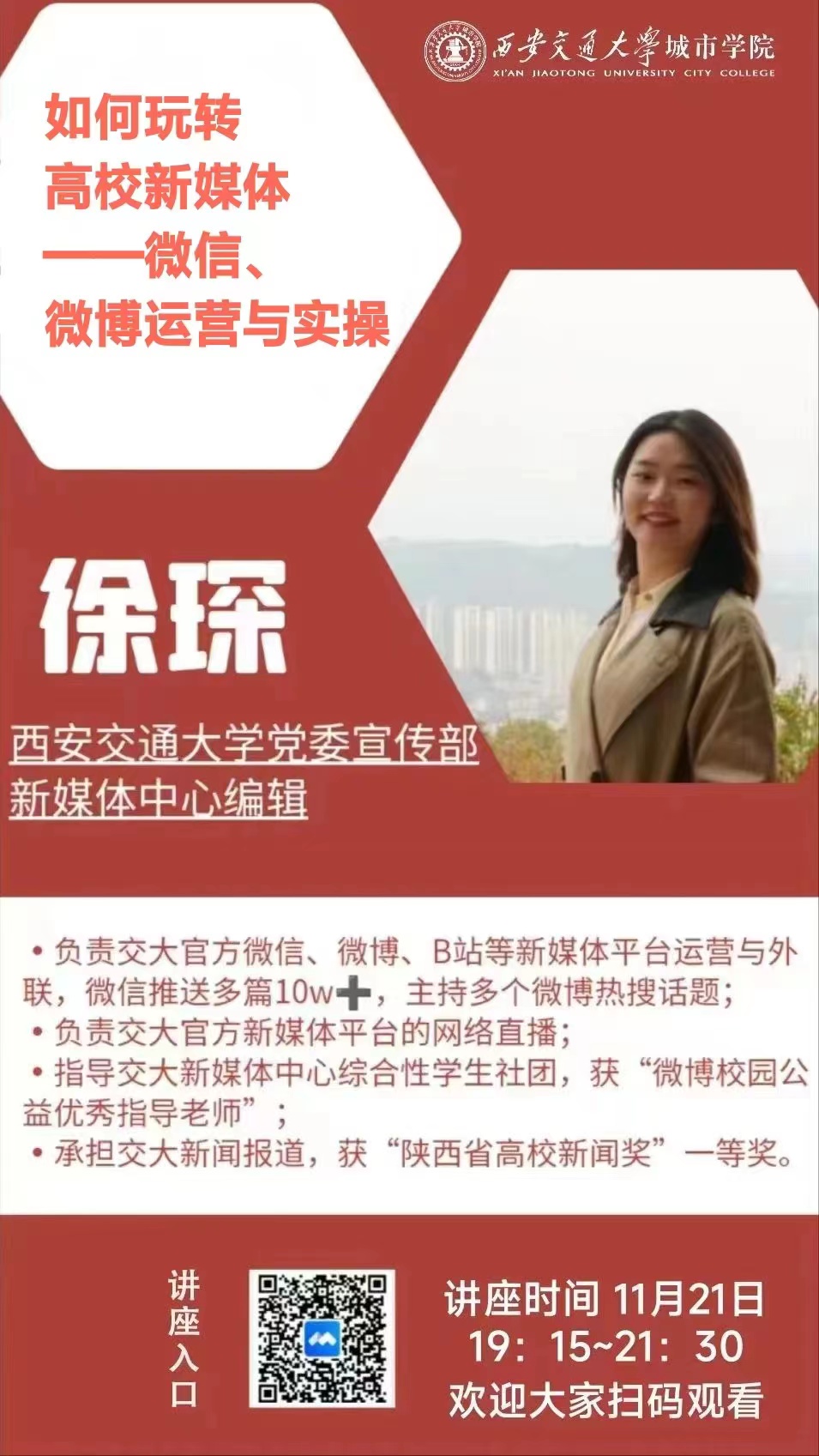 主讲人简介:徐琛,现任西安交通大学党委宣传部新媒体中心编辑,负责交大官方微信、微博、B站等新媒体平台运营与外联,微信推送多篇10w➕,主持多个微博热搜话题;负责交大官方新媒体平台的网络直播;指导交大新媒体中心综合性学生社团,获“微博校园公益优秀指导老师”;承担交大新闻报道,获“陕西省高校新闻奖”一等奖。