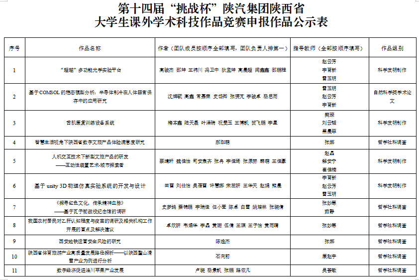 根据《关于组织开展第十四届“挑战杯”陕汽集团陕西省大学生课外学术科技作品竞赛的通知》的通知,结合我院具体情况,经学院内外专家评审意见审核,拟推荐以下11件作品申报参加第十四届“挑战杯”陕汽集团陕西省大学生课外学术科技作品竞赛,现将作品予以公示。