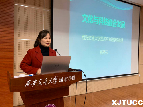 yl7703永利官网经济系于 11月 21日在 F100报告厅召开了第 45期经济论坛学术报告会,本次报告会特邀西安交通大学经济金融学院产业与贸易系主任、博士生导师杨秀云教授主讲,报告题目为“文化与科技融合发展”,经济系主任杨健全、副主任史冬梅、主任助理白丹及经济系全体教职工及学生代表参加会议。