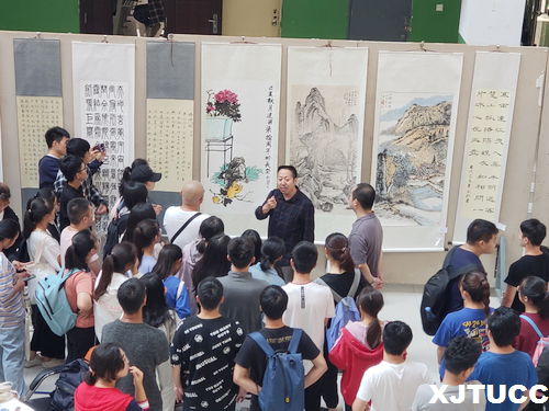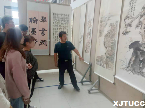 联展首日,由艺术系主任解安宁教授、副主任张春新副教授、艺术系专业教师及艺术系学工办老师带领同学们现场欣赏各参展作品。在观展过程中,解安宁向大家传授了关于绘画与书法的表现技巧和自己多年来对艺术创作的理解,并根据现场学生作品提出指导性意见。除此之外,部分展品的作者也现身现场为大家讲述了自己的创作历程与绘画手法。通过讲解与相互之间的艺术交流,加深学生对艺术理论知识的认识,学生之间也更直观的了解到参展作品的创作理念以及艺术精神。