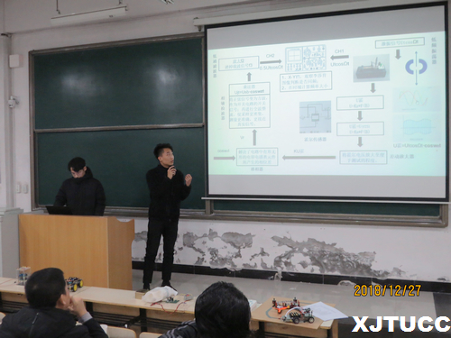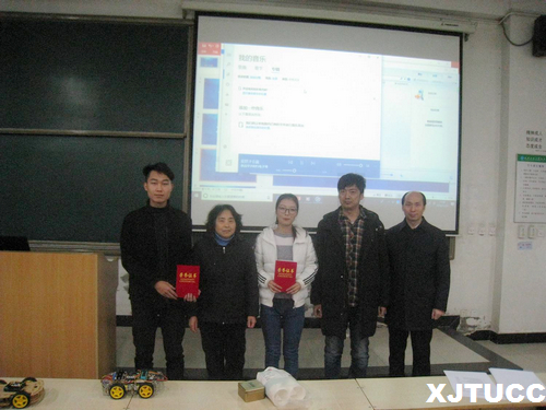 接下来,14个兴趣小组学生依次汇报了本届开放实验的工作,涉及到混沌的认识及混沌电路的制作、霍尔式机械平行梁自振频率测量、光电器件特性及应、透明灯光小音箱的设计制作、路灯控制系统的设计制作、智能机器人测温系统的设计与制作、手机充电器的设计制作、互感现象演示仪的改进与制作、万用表的改装、调试与综合使用研究、声速的测定仿真实验模拟、基于Unity3D的物理实验教学软件制作、大学物理实验公众号建设等19项研究课题,成果形式丰富多样,包括幻灯片报告,视频展示和实物模型。从学生激情飞扬的汇报中可以看出,经过12周的学习和研究,各小组认真努力,准备充分,大部分小组得到了理想的结果。最后评出了一等奖2项、二等奖3项,三等奖3项,优秀奖6项。韩红建老师、史艳莉老师和牛海波老师为获奖学生代表颁发了荣誉证书。