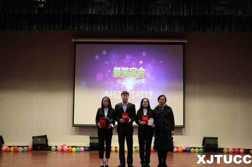 在随后的“宿管阿姨的采访视频;《以梦为马》的诗歌朗诵;激动人心的“有奖问答”;吉他伴唱歌曲《遇见》;“暴走团学”部长舞蹈等节目为在座的各位老师和同学们呈现了一场精彩的视觉盛宴,将现场气氛推向了高潮。之后生活部部长黄慧对本次活动进行了总结发言,她希望同学们在日后生活和学习中都能传播正能量,注重每个宿舍和谐文化的建立,培养良好的舍友关系。接下来优秀宿舍代表张艾以ppt形式分别向大家展示了宿舍照片并对其宿舍成员进行了介绍。本届宿舍文化节经过历时一个多月的室内外活动组织、和谐文化宣传、海报制作、汇报表演等环的最终评选出最美宿舍3间;突出贡献奖宿舍4间;视觉冲击奖宿舍1间、一二三等奖宿舍各1间。