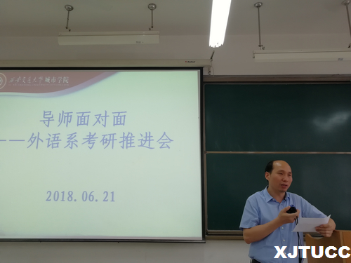 为帮助外语系学生明确考研目标、积极开展考研复习备考、掌握相关考研技巧、了解更多考研信息,同时与高层次院校建立良好联系、加强研究生生源基地建设,外语系于6月21日在D309教室举行了考研推进会活动。本次活动邀请西安工程大学人文社会科学学院院长助理孙迪博士、外语学科后备带头人刘丽副教授、MTI中心主任李娜副教授以及戏曲喜剧硕士教学中心主任王衡教授主讲,院长助理韩红建副教授出席本次活动。外语系2015级全体学生到场参会。