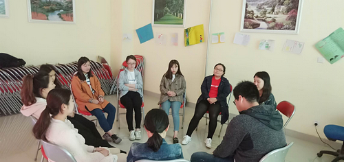 培训活动自4月8日至4月26日,分四次开展。首次培训中,段老师介绍了团体辅导的内涵、适用范畴及基本发展阶段,通过体验式培训,从团体辅导的热身环节、订立团队契约、分组行动到组建团队,鼓励老师们敞开心扉,增进交流,建立良好的团队关系。第二次团辅中,段老师带领成员利用“情绪雕塑”、“镜中人”游戏感受情绪语言、提高共情能力,通过分组竞赛促进团队合作,激发身体潜能。第三次团辅中,通过一系列认识自我的活动安排,促进成员自我探索,利用团体资源解决成员近期的困惑,增进团体信任感。最后一次团辅中,利用趣味接龙、荒岛求生等游戏热身,优点轰炸让成员的心与心更加贴近,生涯环游让成员们打开与自身心灵的对话,感受与自己身体的“连结”。