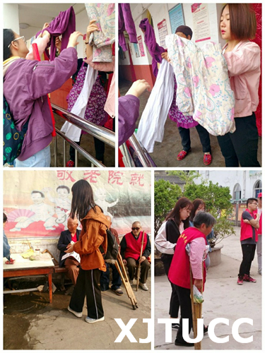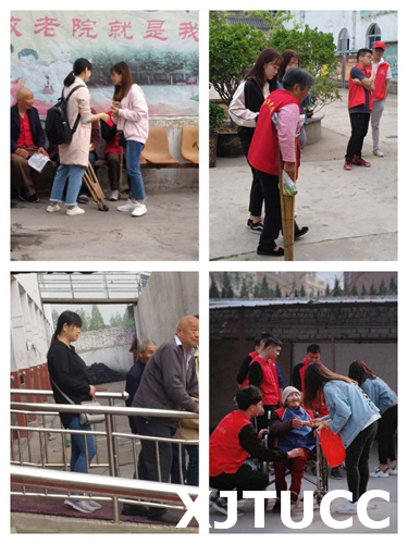 上午九点大家到达目的地,将慰问的物资发给了每位老人,为老人们做了些力所能及的事情,比如,和老人们一起聊天,为他们晾晒衣服等。随后,为老人们献上了一首首怀旧歌曲,勾起了老人们美好的回忆。最后全体以一首歌曲《相亲相爱》结束了此次活动。