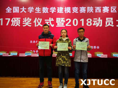12月22日下午,全国大学生数学建模竞赛陕西赛区2017颁奖仪式暨2018动员大会在西安理工大学隆重举行。学院教学服务中心主任助理冯鹏林、数学教学部常务副主任于大光、竞赛指导教师董福安三位老师带领获奖学生代表参加了颁奖仪式。