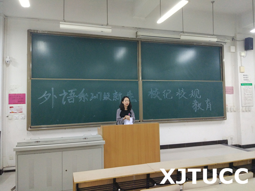 为进一步加强外语系精神文明建设,加强系风学风建设,强化新生对学院相关规章制度的学习和认识,培养学生自觉遵守校纪校规的意识,从而营造和谐的生活、学习氛围, 9月29日晚,外语系在D100开展了2017级新生入学教育系列活动之校纪校规教育。此次活动由我系新生辅导员蔺一方主讲,2017级全体新生到场参加。
