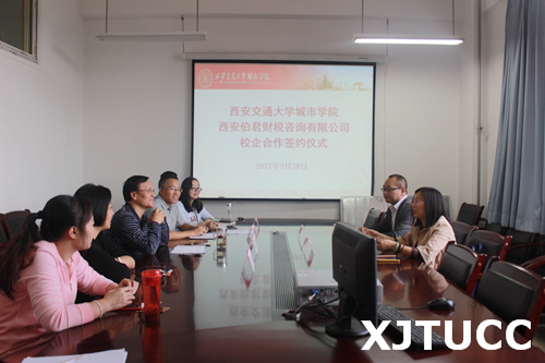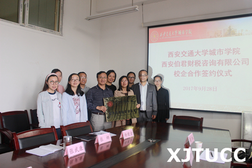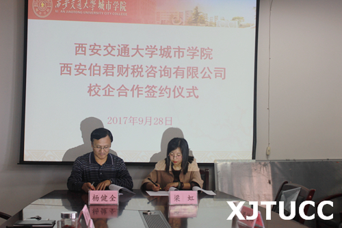 9月28日下午,yl7703永利官网经济系与西安伯君财税咨询有限公司在教二225会议室举行校企合作签约仪式。西安伯君财税咨询有限公司副总经理梁虹女士、行政总监梁增辉先生、yl7703永利官网经济系主任杨健全、副主任史冬梅、张武康、财政专业负责人张娜、系创新创业发展研究室负责人白丹、系学生工作主管廉宇婷、系团工委书记叶超、财政学专业教师冯茜出席本次会议。