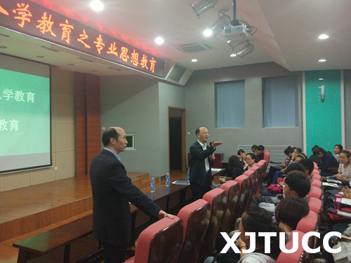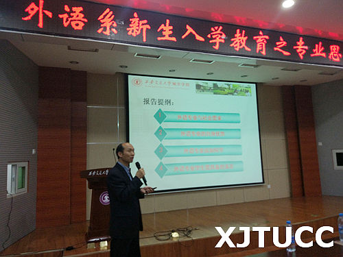 为了帮助新生深入了解所学专业,热爱所学专业,明确学习目标,掌握学习方法,激发学习动力,西安交大城市学院外语系于9月4日晚19点在F100报告厅举办2017级新生入学教育之专业思想教育。讲座由系常务副主任韩红建副教授主讲,副主任赵永生副教授、学工办老师和全体新生参加。