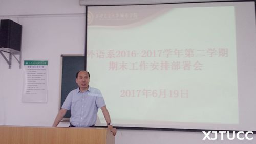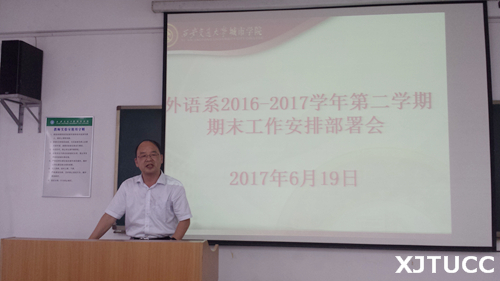 为切实做好本学期期末教学工作,保证各项工作有序、顺利地进行,6月19日下午,西安交大城市学院外语系在教学楼B304教室召开了由全系教职工参加的2016-2017学年第二学期期末工作安排部署会。