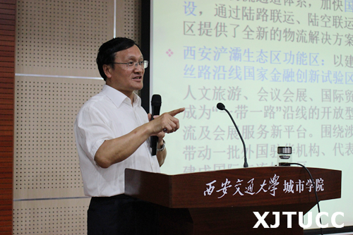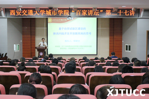 主持人对杨健全教授进行简短的介绍之后,报告会正式开始。杨健全教授首先提出,当代大学生在大学期间应该要做到“四个一百”,即参加学术报告一百场、认识一百位老师、读一百本书籍和参加一百次社会实践活动。希望学生积极参加双创活动,锻炼自己的创新思维。随后,杨健全教授在主题讲座--基于自贸试验区建设的陕西内陆开发开放新高地的思考中谈到,这是我省对于国家战略“一带一路”的强烈响应,并且得到了党中央国务院的积极支持。他从研究背景及意义,陕西建立内陆开发开放新高地的优势条件、实证分析和推进陕西内陆开放开发新高地的对策建议等四方面进行了详细的阐述和解释。从宏观背景到微观策略、从省会西安到四周区域,杨教授的精彩讲授深入浅出,令现场同学信服,更让同学们获益匪浅,开拓了自身眼界与思维。最后,杨教授还跟现场提问的同学们亲切交流,耐心回答了同学们的提问。