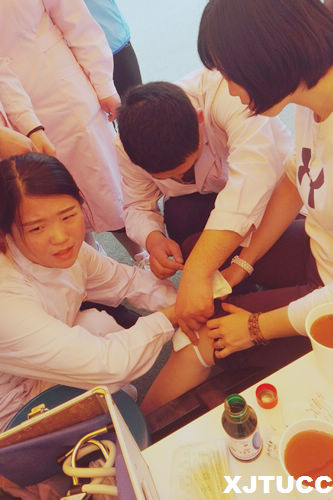 运动会开始不久,一位运动员在跑步时摔倒,膝盖擦伤无法正常行走,护理队队员们迅速赶往现场,协助校医院的医生为受伤运动员进行了消毒、喷药、包扎等一系列救护处理,为运动员提供了及时的医疗服务保障。在比赛中,陆续有扭伤、擦伤、晕倒的学生需要救护,护理小分队都及时协助校医院的医生进行了紧急医疗护理和伤病处理,为运动会的顺利举行提供了良好医务服务保障,受到了师生们的肯定。