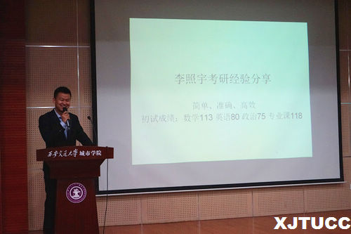 随后带来经验分享的是跨专业考研的马良菲同学。她告诉同学们准备考研的第一步就是要学会扬长避短,选择一个适合自己的专业以及与自身实力相匹配的学校。其次她介绍了各科的备考方案,使得同学们受益匪浅。
