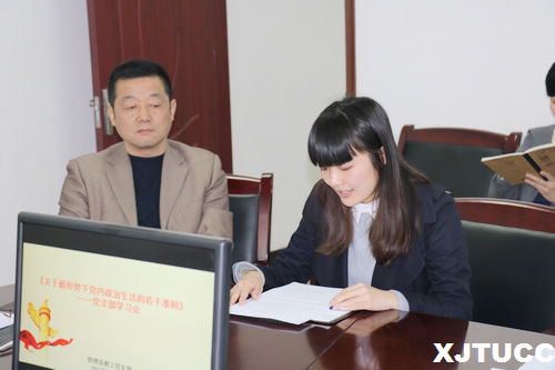 下午管理系教工党支部在2-225召开《关于新形势下党内政治生活的若干准则》的学习会,管理系主任卫民堂、管理系党总支书记冀祥、副主任郭关科以及全体党员同志参加了本次会议,会议由支部书记许玮玮主持。