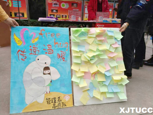 现代社会高速发展,人情却越发淡漠,伴随着电子产品的普及,太多的年轻人成了“宅男宅女”“低头族” ,走路时、吃饭时、上学路上、回寝路上,大家本该年轻活力的面庞更多时间却是在面对手机和电脑屏幕前,与身边的人的交流日渐减少,人与人面对面交流感受温暖的机会也因此大大减少。因此11月9日中午,志愿服务队在中快楼下举行了“冰释冷漠,传递温暖。Let’s free hugs!”的主题活动。志愿者们拿着传单向过往的同学介绍活动的内容与意义,在志愿者们的热情邀请下,许多同学都放下羞涩与戒备,去感受拥抱的温暖与真情,参与活动的同学均获得饮品和小礼物。拥抱过后,同学们写下了自己对这次活动的祝福,将自己的名字写在横幅上,用爱心传递温暖。我们希望活动以自由拥抱的形式,增进人与人之间的亲切感,促进交流,传递温暖,活动也为大家创造了一个大家播下友谊的种子的平台。
