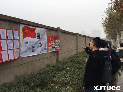 11月14日晚,管理系1401党支部召开征文比赛与主题图片展遴选会,展示了支部成员撰写的优秀作品,并邀作者讲述了作品背后的故事及蕴含的意义。活动结束后,党支部将挑选出来的作品做成宣传海报,并于11月17日张贴在教二楼下,吸引了很多学生驻足观看。