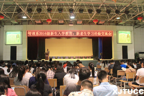 用心声交流,让梦想启航。为引导管理系2016级新生对崭新的大学生活有全面的了解和认识,尽快进入自身角色,明确自身定位,树立自身目标。9月13日晚七点,管理系于大学生活动中心举办了“管理系2016级新生入学教育第四讲:新老生学习经验交流会”。此次会议由管理系学生工作主管刘健、辅导员韩珺、李辉、系学生干部代表及管理系2016级全体新生共同参加,大会由管理系学生干部史青主持。