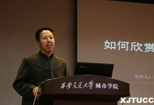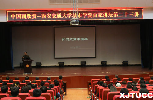 解教授以世界美术的三大体系为开篇,带领现场师生走进艺术领域。首先以西方和中国的历史文明以及流域、文化的对比,阐述文化的本质和基本的行为规范,了解欧洲古董派理性主义和西方现代非理性主义。在如何欣赏中国画方面,解教授主要通过众多中西方作品的风格特点比较,凸显西方绘画作与中国绘画的不同之处,深刻剖析中国画的以线造型、计白守黑、单纯用色、散点透视、神情志趣、款印合璧等特点,向观众阐述中国画运用线条的表达追求无画处皆为妙境。