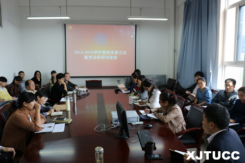 10月14日中午,西安交大城市学院管理系2015-2016学年第三次教学法研讨会在教二225顺利召开。本次研讨会主要围绕“学院教学会议内容通报”、“科研工作规划”、“学习心得交流”三部分展开。出席研讨会的领导及老师有管理系常务副主任冀祥,副主任王小青以及会各个专业教学研究室的各位老师。讨论会在王小青副主任主持下召开。