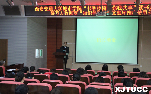 为进一步营造浓郁书香的校园读书氛围,迎接一年一度的世界读书日,西安交大城市学院图书馆于4月24日下午在F100报告厅携手行知书友会、百草园文学社共同举办“书香校园,你我共享”读书月活动启动仪式暨万方数据商“知识伴我行”文献库推广使用公益讲座。启动仪式由图书馆张勇副馆长主持,图书馆叶春峰馆长、万方数据培训师白帆多老师、图书馆各位老师及学生代表参加。