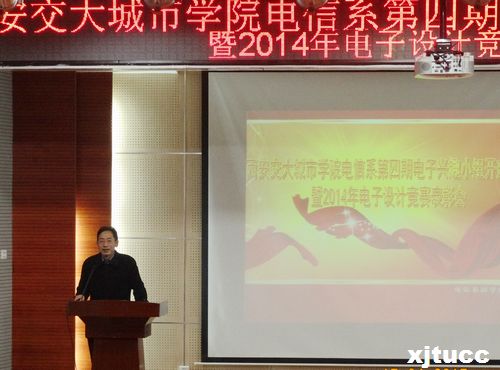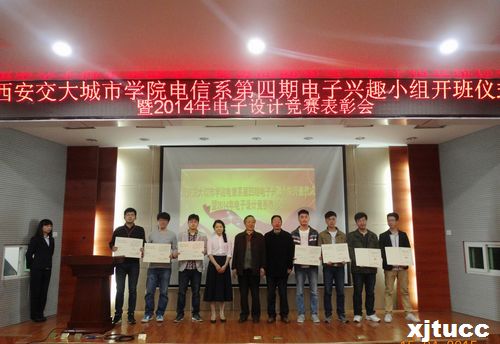 为培养同学们的专业兴趣,鼓励大家积极参加科技竞赛,西安交大城市学院电信系于4月15日下午1点在F100报告厅隆重举行第四期电子兴趣小组开班仪式暨2014年电子设计竞赛表彰会。电信系主任赵录怀教授、院教授会主席申忠如教授、系主任助理张倩、团工委书记张天应邀参加。大会由电气302班刘洋同学主持。
