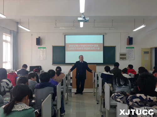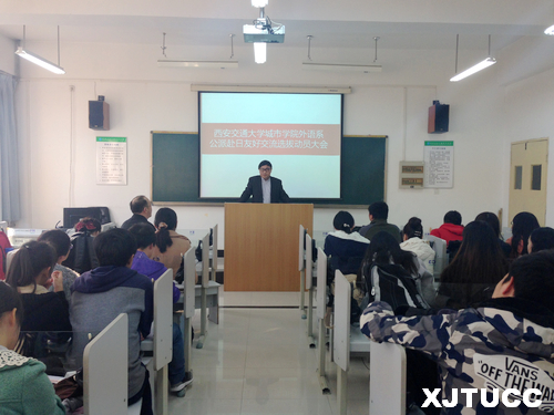 应日本中日友好会馆邀请,西安交大城市学院外语系将选派3名学生赴日进行友好交流。11月19日下午3 时,由外语系组织的公派赴日友好交流选拔动员大会在B307召开,出席本次大会的有外语系副主任赵永生、日语专业首席教授李国栋及日语专业所有学生。
