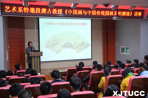 11月20日晚7点,西北农林科技大学风景园林艺术学院院长、装饰设计研究所所长、博士生导师段渊古教授应西安交大城市学院艺术系主任解安宁教授的邀请,在城市学院F100报告厅进行了"中国画与中国传统园林艺术的渊源"主题讲座,陕西省山水画研究会副主席王全忠老师作为嘉宾出席。艺术系领导和200多名师生参会。