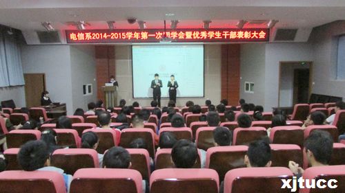 10月21日晚7时,电信系于F100举行了“2014-2015学年第一次团学干部会暨优秀学生干部表彰大会”。出席大会的有电信系团工委书记张天,辅导员闫新慰、刘育斌、马佳辰。电信系团工委和学生会全体成员参加了本次大会。大会由卢楠楠和李涵同学主持。