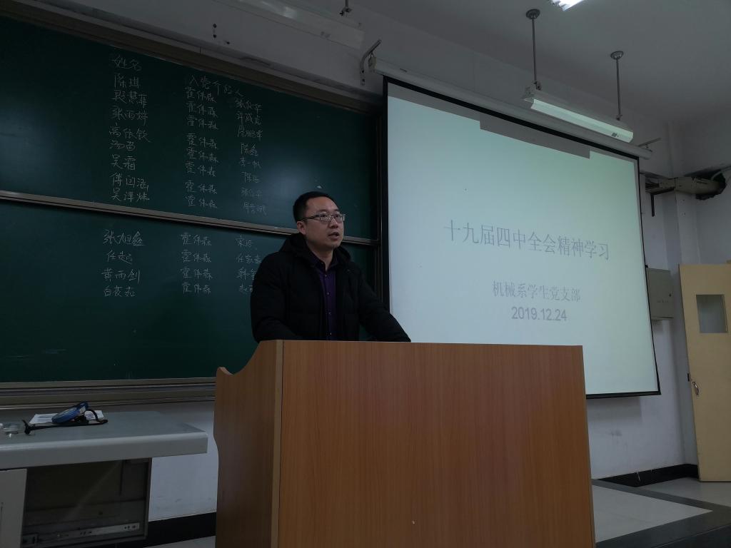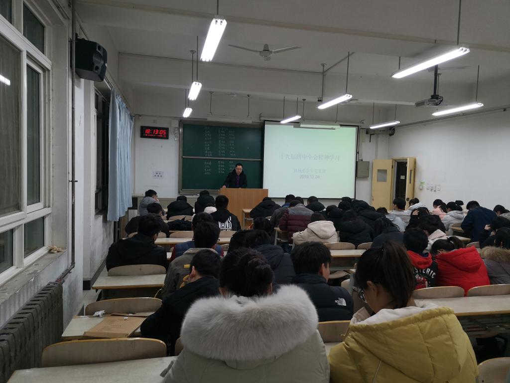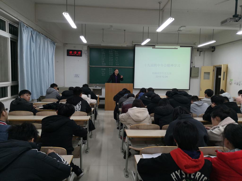 12月24日,机械系学生党支部在学院教学楼D107开展了十九届四中全会专题学习。会议由学生党支部书记霍伟森主持,组织委员张俊华及全体学生党员参加。