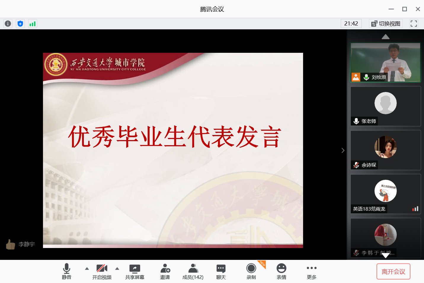 第二项优秀学生代表发言,张布泽同学,为团学工作做出了很大的贡献,几乎系里组织的所有活动都能看到他的身影,从作为干事做一些细小的杂事到成长为独当一面的学生会主席,将外语系学生会打造成了一个团结向上、勇于创新的组织。王张磊同学,学习勤奋刻苦,作为班长做事认真负责,不仅自身成绩优秀,还带领英语172班连续获得“优秀班级”称号,并且作为朋辈大使,将自己所学毫无保留地传授给低年级同学,在学生、生活上都是学弟学妹们的好榜样。