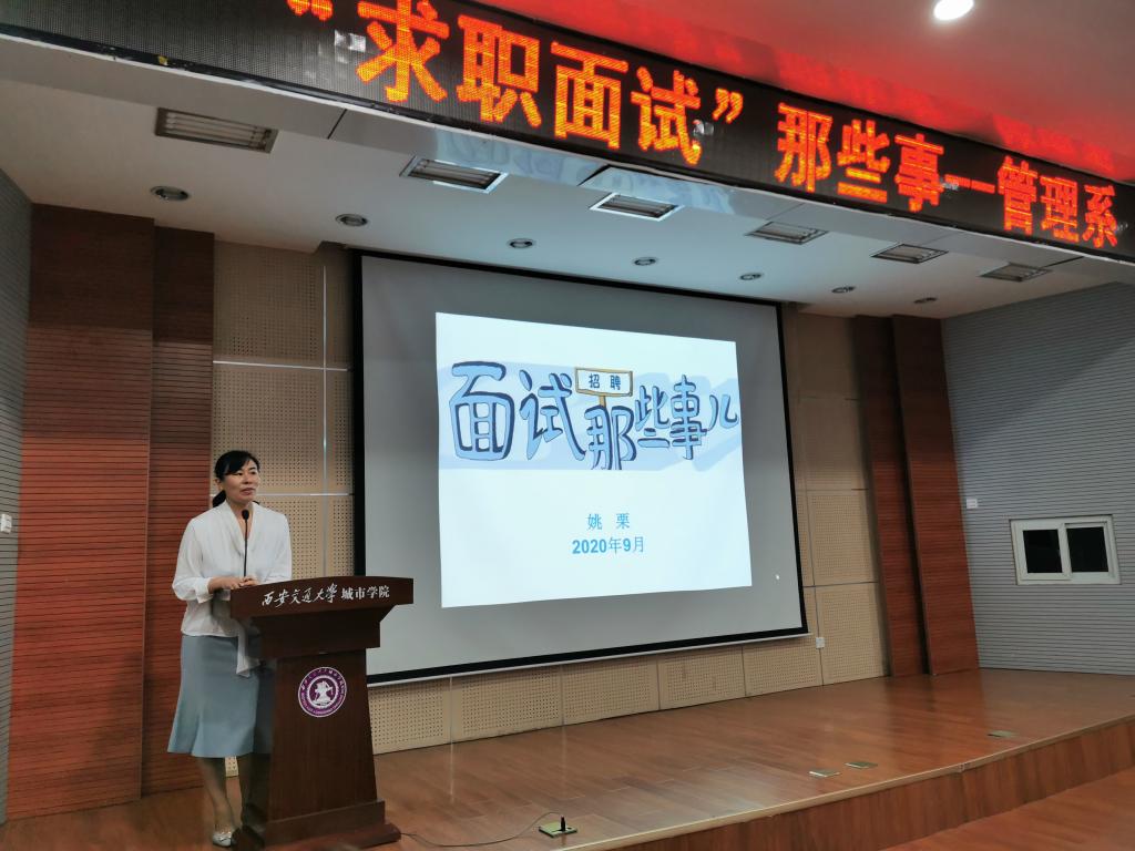 为加深2021届毕业生对面试工作的了解,找到适合自己的工作岗位,yl7703永利官网管理系于9月15日下午在F100举行了“求职面试那些事”专题讲座。讲座邀请了国家高级人力资源管理师、陕西省人才服务中心特聘讲师姚栗主讲,出席本次讲座的老师有管理系副主任郭关科,学生工作主管刘健以及全体毕业班辅导员。讲座由刘健主持。