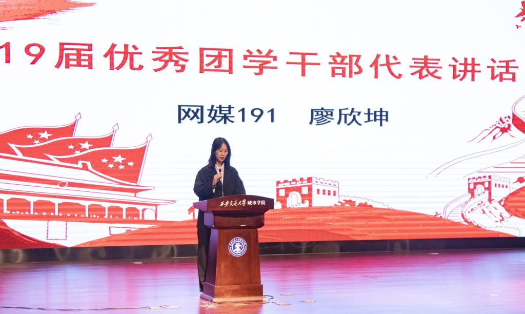 伴随着高昂的团歌,大会正式拉开序幕。首先,由团工委书记陈欣老师为2019届优秀团学干部颁发荣誉证书。随后由2019届优秀团学干部代表廖欣坤同学发言,她主要分享了加入团学会以来的收获,并且非常感谢传播系团学会能够提供给她这个平台去锻炼自己。同时廖欣坤同学还感谢了陈欣老师在她工作期间对她的关心与帮助。