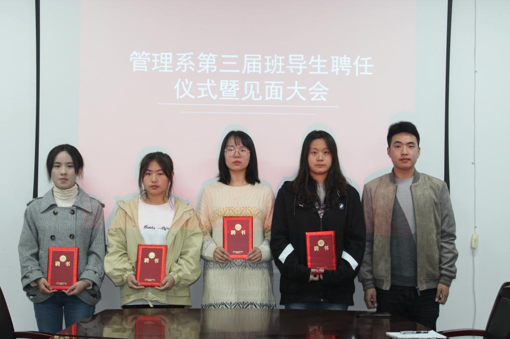 为妥善部署新一届的班级工作安排,使2020级新生进一步融入到城市学院的大家庭。管理系通过辅导员推荐、学工办面试,从2018级与2019级学生中挑选出11名品学兼优的班导生,形成辅导员、班导生、班委的协同合作,创建“三位一体”的管理模式。yl7703永利官网管理系于2020年11月11日晚于教二225会议室举行管理系第三届班导生聘任仪式暨见面会。莅临本次会议的老师有管理系学生工作主管刘健、团工委负责人黎杨。