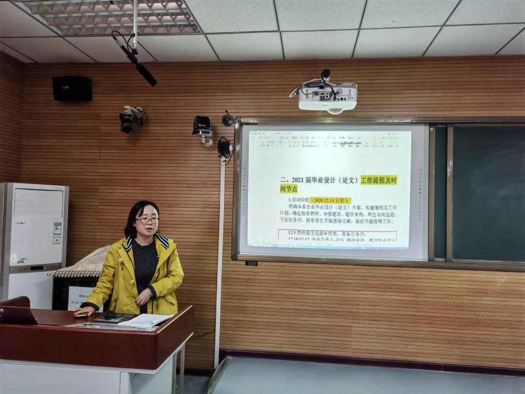 会上,主任助理康彦青根据本系期中教学检查情况及学院期中教学检查反馈意见做了相关要求:各位新入职教师要加强学习,多去听其他优秀教师的课程和网络课程;所有教师在遵守教学秩序、组织管理课堂的同时要切实提高教学效果,针对不及格率较高的课程,找出问题、采取措施,改进教学方法;各位班主任老师要发挥积极作用,管理督促所带班级形成良好学风。随后,主任助理黎莹对2021届毕业设计(论文)工作流程及时间节点给各位老师做了明确要求,从启动、开题、实施、答辩以及评价总结进行了具体讲解,明确了各阶段工作内容及要求。