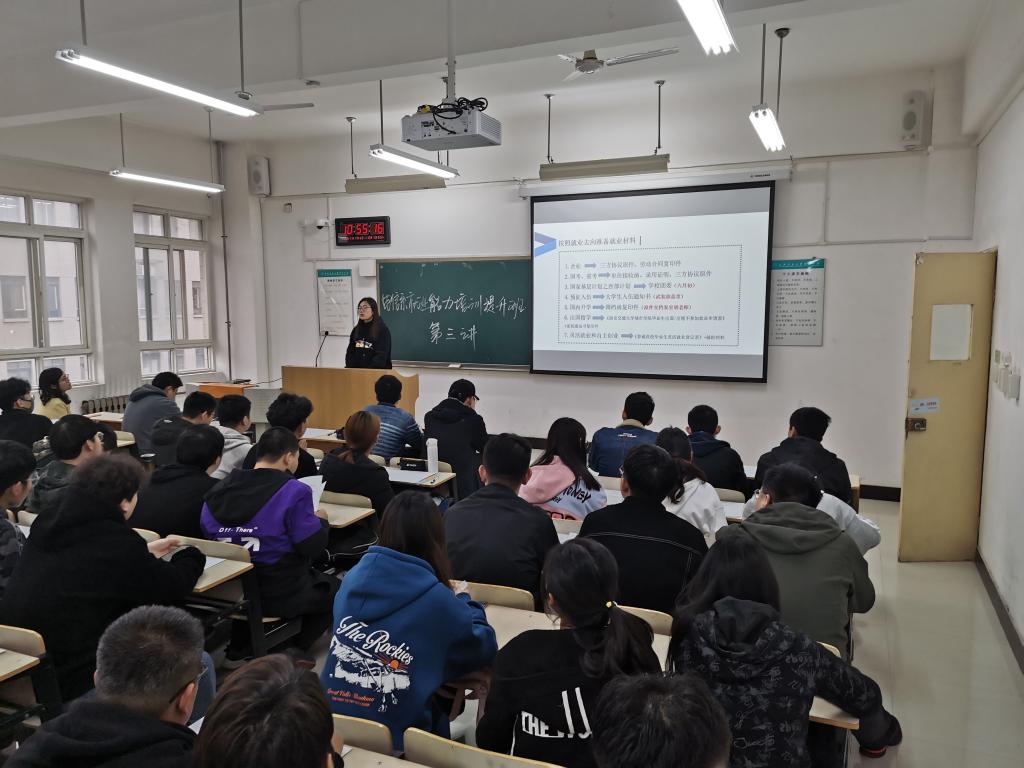 首先,王姣老师对全体学生就业材料的准备进行了指导,重点介绍了毕业生三方协议及毕业生就业推荐表等就业材料在学生求职过程中的意义和作用,从毕业生基本情况、教育背景、个人简历、综合能力表现、学业成绩、自荐书、附件内容等部分的填写为同学们进行了详细的讲解。