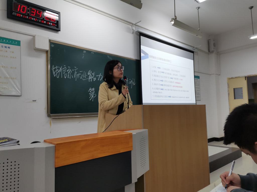 随后,班主任郭霞老师分享了自己大学时期的求职经历,她不断参加招聘会并一步步调整求职目标最终找到工作的经验帮助同学们明白了目前大学生的就业形势越来越严峻,只有树立先就业后择业的观念并积极主动参加各类招聘会才有可能找到一份适合的工作。