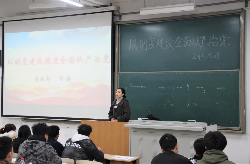 为进一步引导大学生骨干坚定的政治纪律和政治规则,加强对学生干部的培养,我院团委于11月28日中午在教学楼E100开展了“以制度建设推进全面从严治党”为主题的“青马工程”培训班第二讲,本次主讲人为学院思政教学部常媛,由庞丝丹同学主持。