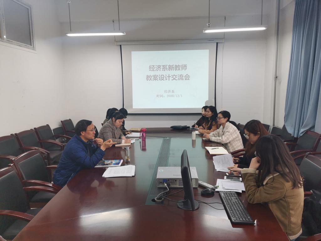 为进一步提升经济系新教师的教学水平,推进一流本科课程建设工作,12月1日下午,经济系全体教职工在教2-225室召开新教师教案设计交流会,会议由国贸教研室负责人王世杰主持。