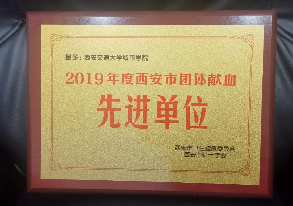 此次活动开始前,学院还收到了由西安市卫生健康委员会、西安市红十字会共同颁发的“2019年度西安市团体献血先进单位”荣誉奖牌。
