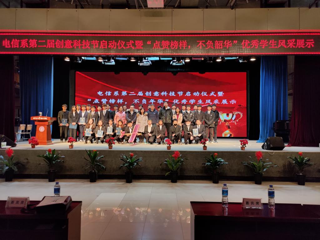 12月16日下午,电信系在学生活动中心召开第二届创意科技节启动仪式暨“点赞榜样,不负韶华”优秀学生风采展示活动。莅临本次大会的嘉宾有电信系主任助理张永超,电信系实验室主任何诚刚,电信系办公室主任潘雪柳,电信系实验室教师韩雅莉、段雯,电信系学生工作主管王姣,中兴学院学生工作主管樊超,团学负责人梁新雨及辅导员张华,全系学生参加本次大会,大会由崔景昕同学主持。
