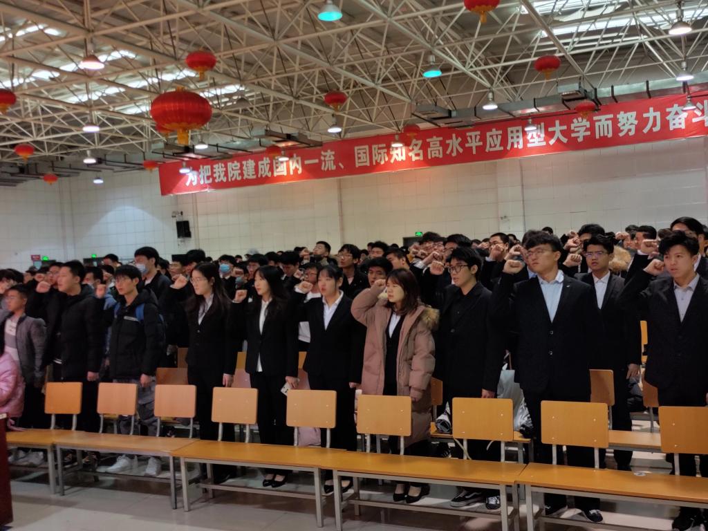 经验分享后,在王燕同学的带领下,全体与会学生高举右拳,以创新的名义宣誓要牢记时代使命,为中华民族伟大复兴贡献出自己的力量。