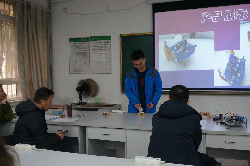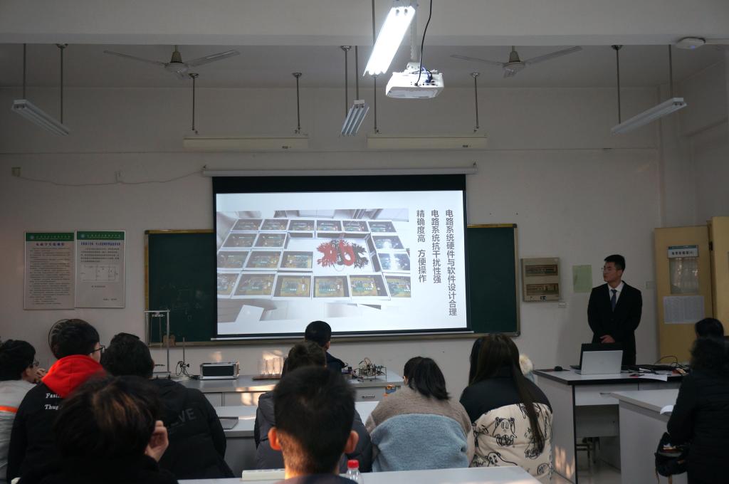 接下来,12个兴趣小组学生依次汇报了本届开放实验的工作,涉及三维虚拟弹性模量实验仪、自制物理实验仪器的实践、一种智能压电生物传感器的研究、3D打印机的维修与使用、混沌现象演示仪的制作、循迹与避障小车设计与制作、环保节能降温装置试验、电磁炮的设计与制作等12项研究课题,成果形式丰富多样,包括幻灯片报告、软件展示和实物模型。从学生激情飞扬的汇报中可以看出,经过12周的学习和研究,各小组认真努力,准备充分,大部分小组得到了理想的结果。其中三维虚拟弹性模量实验仪、自制物理实验仪器的实践可作为自制实验设备为后续综合实验和其他实验教学作为案例教学,也为后续参与实验竞赛打下了基础。最后评出了一等奖3项、二等奖4项、三等奖5项。