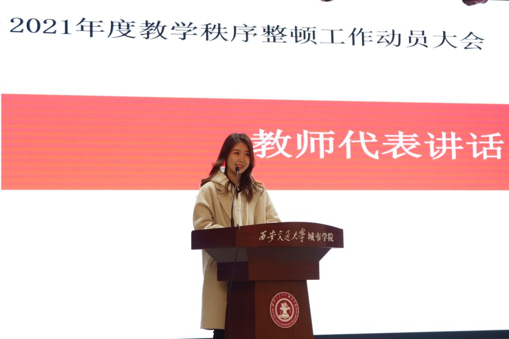 大会第三项,由播音与主持艺术专业教师吴璇发表讲话。讲话中吴璇再次强调了教学秩序整顿的重要性和紧迫性,以教师的角度提出对传播系学子的美好祝愿,并倡导学风更加规范化、有序化。大会在一片掌声中落下帷幕,希望传播系学子能够在新的学期重视自身建设,展现全心魅力。