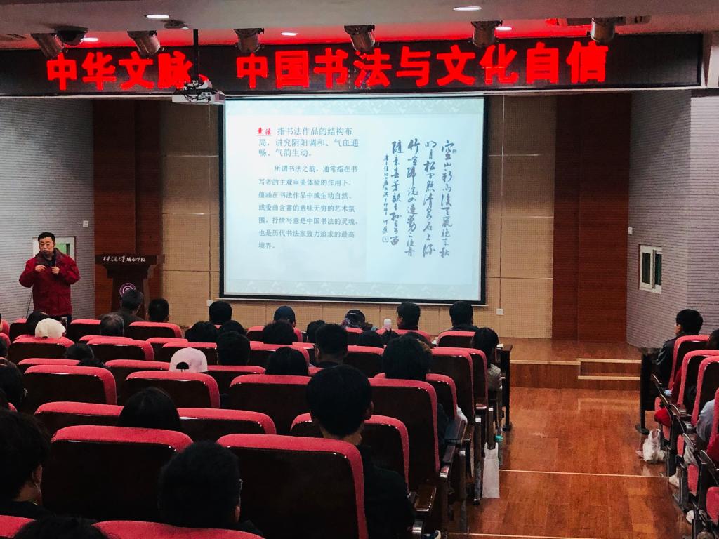 3月18日晚,应学院艺术系邀请,陕西省社会科学院研究员,西北大学艺术研究院副院长,享受国务院特殊津贴专家,何炳武研究员在F100报告厅作了“中华文脉·中国书法与文化自信”的学术报告。艺术系主任解安宁教授及全体老师参加本次活动,讲座由书法专业负责人韩钧主持。