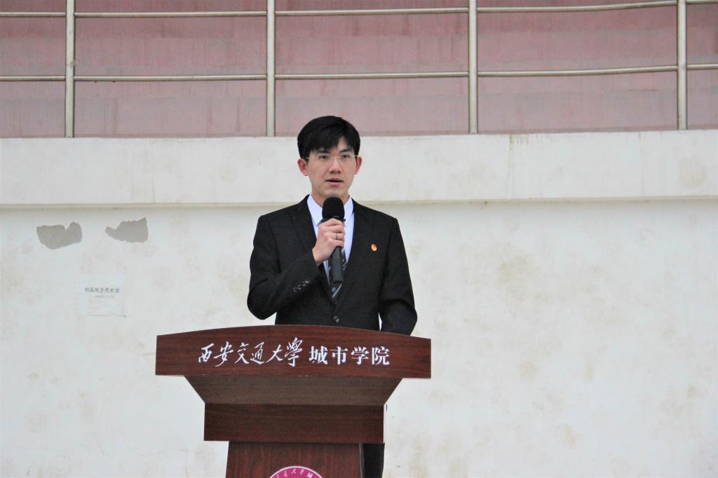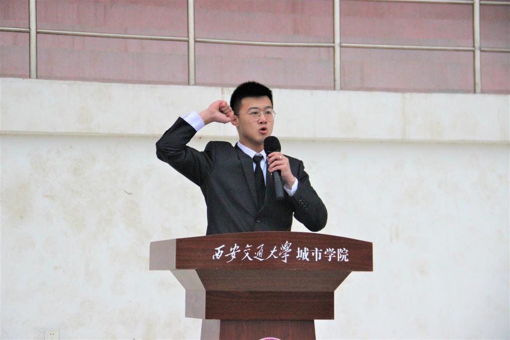 礼毕后,院学生会执行主席陆一洲同学作为学生代表上台演讲。陆一洲同学指出作为新时代发展的主流力量,我们青年应该有“上青天,揽明月”的意志,敢于树立远大梦想,且不断为之奋斗,积极投身于社会主义建设,将五四精神发扬光大。随后,团委组织部李炳成同学带领新老团员宣誓,重温入团誓词。