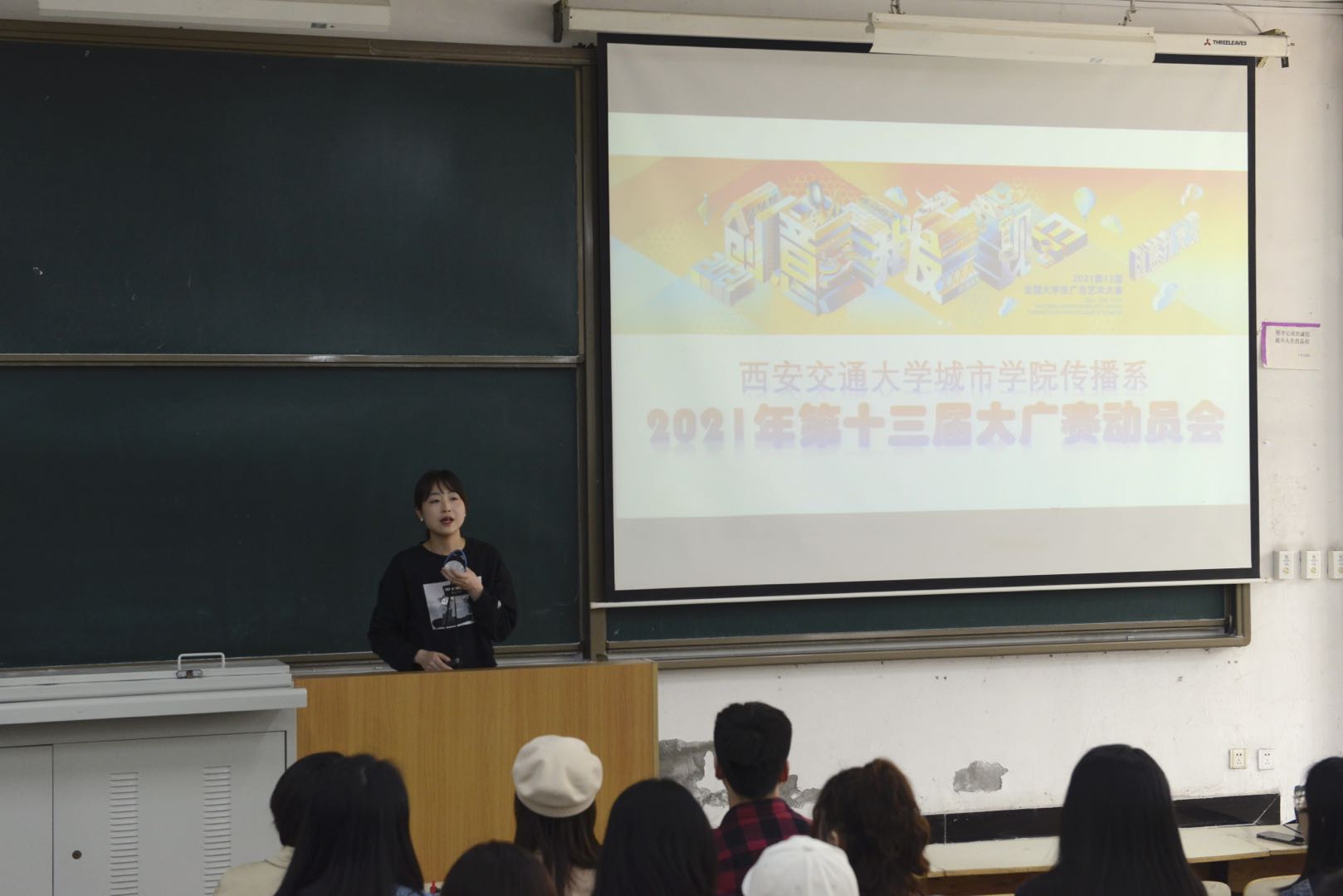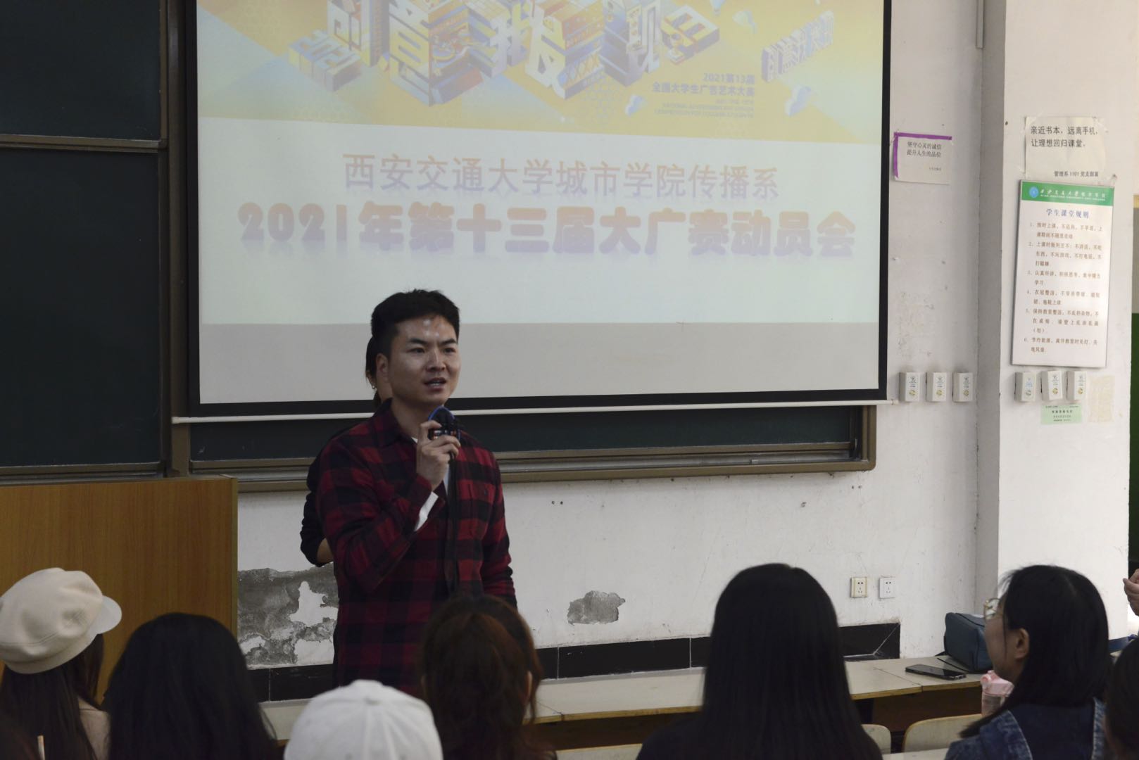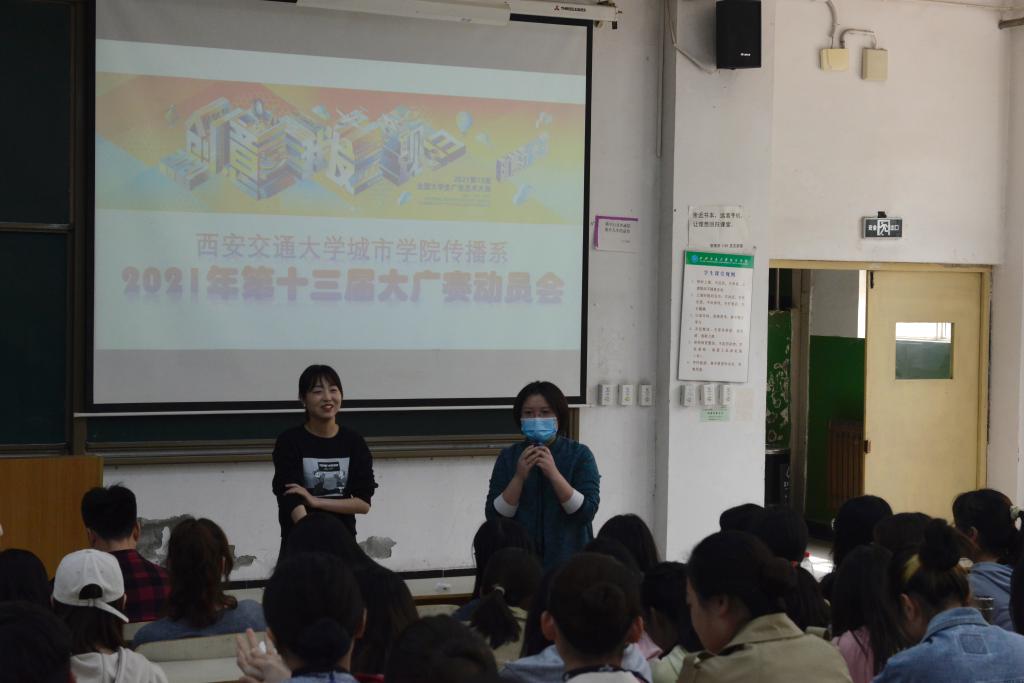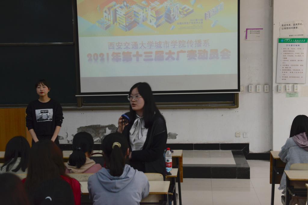为了推进大学生广告艺术大赛(简称大广赛)顺利开展,提高学生参与热情,保证参赛作品质量,4月27日,yl7703永利官网传播系于B100召开2021年第十三届大广赛动员会。系主任助理吴越老师,网络新媒体专业、播音与主持艺术专业共14名教师,全系大一至大三学生参会。本次动员会由2021年系内大广赛总负责人马岚、网媒与播主专业赛事负责人郭晨雪、雷雨三位老师主讲,吴越主持会议。