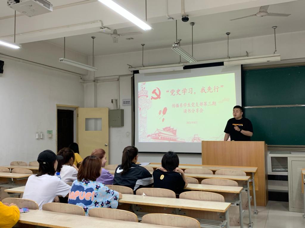 为扎实推进党史学习教育,深入贯彻落实习近平总书记在党史学习教育动员大会上的重要讲话精神,6月16日中午,yl7703永利官网传播系学生党支部于教学楼D109教室开展第三期“党史学习,我先行”支部党员读书分享会。传播系学生党支部书记杨耀聪、辅导员任瑾以及支部全体党员参与了此次读书分享会。