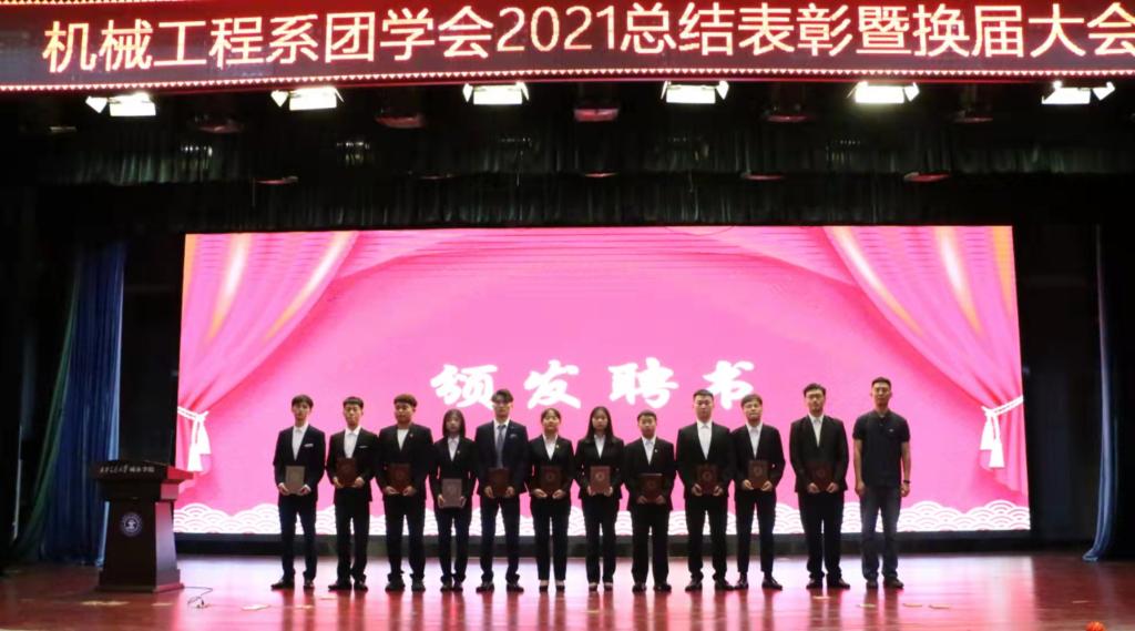 大会第一项在主持人介绍完到场嘉宾后正式开始,全体起立奏唱中国共产主义青年团团歌。第二项,由机械系团工委书记崔佳楠对2021-2022学年团学工作进行部署并宣读第十四届机械工程系团学会优秀成员名单以及第十五届团学会成员名单。接着,在场的各位老师分别为团学会优秀干部及主席团成员颁发奖状与聘书。第四项,第十四届优秀团学干部代表王菲同学发言,她表示在自己两年的团学生涯中,受益颇多,掌握到了有用的技能;接着第十五届主席团代表丁松浩同学发言表示,将一如既往的发挥机械工程系团学会的优良传统,服务师生。