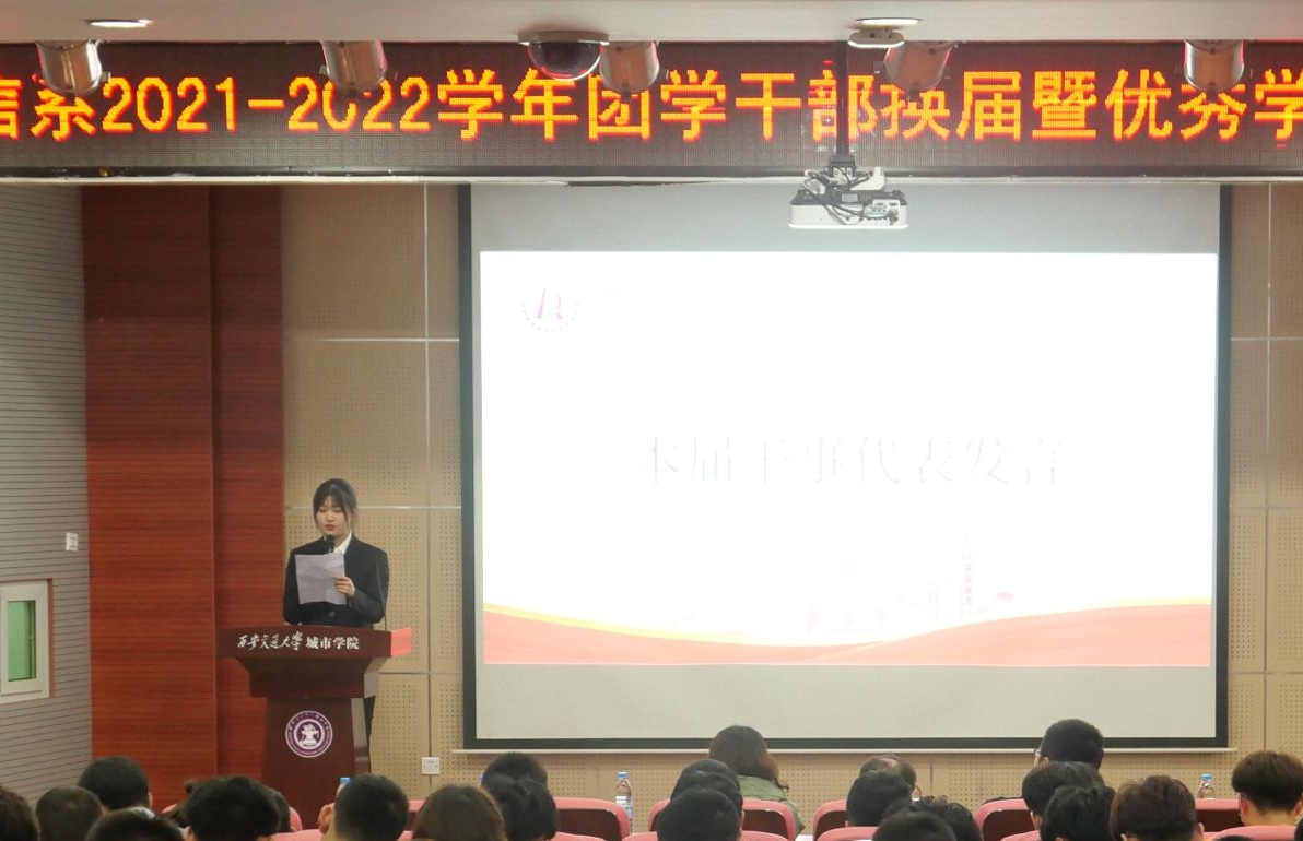 大会第二项由团工委书记徐娟宣读2021届团学干部聘任名单及受表彰学生干部名单并由樊超老师、梁新雨老师为电信192班马雨洁、电信192班方宇之等同学颁发聘书及优秀学生干部颁发荣誉证书;随后由本届主席卢芊芊宣读新任干事名单。