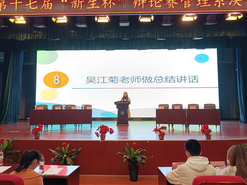 最后,吴江菊针对这次辩论赛的开展进行了最终的总结,她肯定了辩手的能力和团队合作精神,随后通过辩论的意义以及链轮赛的意义强调大学生理性思辨的重要性。并希望大家可以将思辨与学生日常生活联系起来,使思辨存在我们身边。